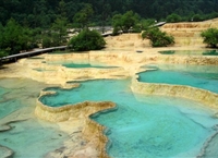 2、翠海"九寨歸來不看水"這句話絕對(duì)是對(duì)九寨溝景色最最真實(shí)的詮釋。在九寨溝,河、灘、泉、瀑組成了一個(gè)五彩斑斕的人間天堂。水便是九寨溝天堂的靈魂。翠海是指九寨最有名的"水",放眼望去,一片青春潔凈、一片青翠碧藍(lán),水面倒影的不只是蒼藍(lán)的天空,周圍蒼翠的青山綠樹也在水波中徐徐倒影。晶瑩剔透、色彩斑斕這類詞語已經(jīng)無法形容這片鏡湖,湖水在陽光的照應(yīng)下仿佛藍(lán)寶石般閃耀著各色的光,站在不同的角度,你一定會(huì)發(fā)現(xiàn)不同的色彩。